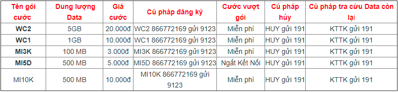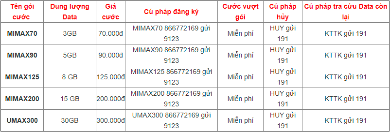 - Nếu bạn muốn sử dụng data trọn gói trong cả tháng mà không bị tính phí phát sinh vượt gói thì Mimax4g chính là một sự lựa chọn phù hợp cho bạn. Qua bảng trên ta có thể thấy, các gói cước 4G viettel đều rất hấp dẫn về dung lượng data ưu đãi nhận được. Mỗi gói đều có mức phí đăng ký khác nhau, phù hợp với mọi đối tượng khách hàng. Cụ thể: